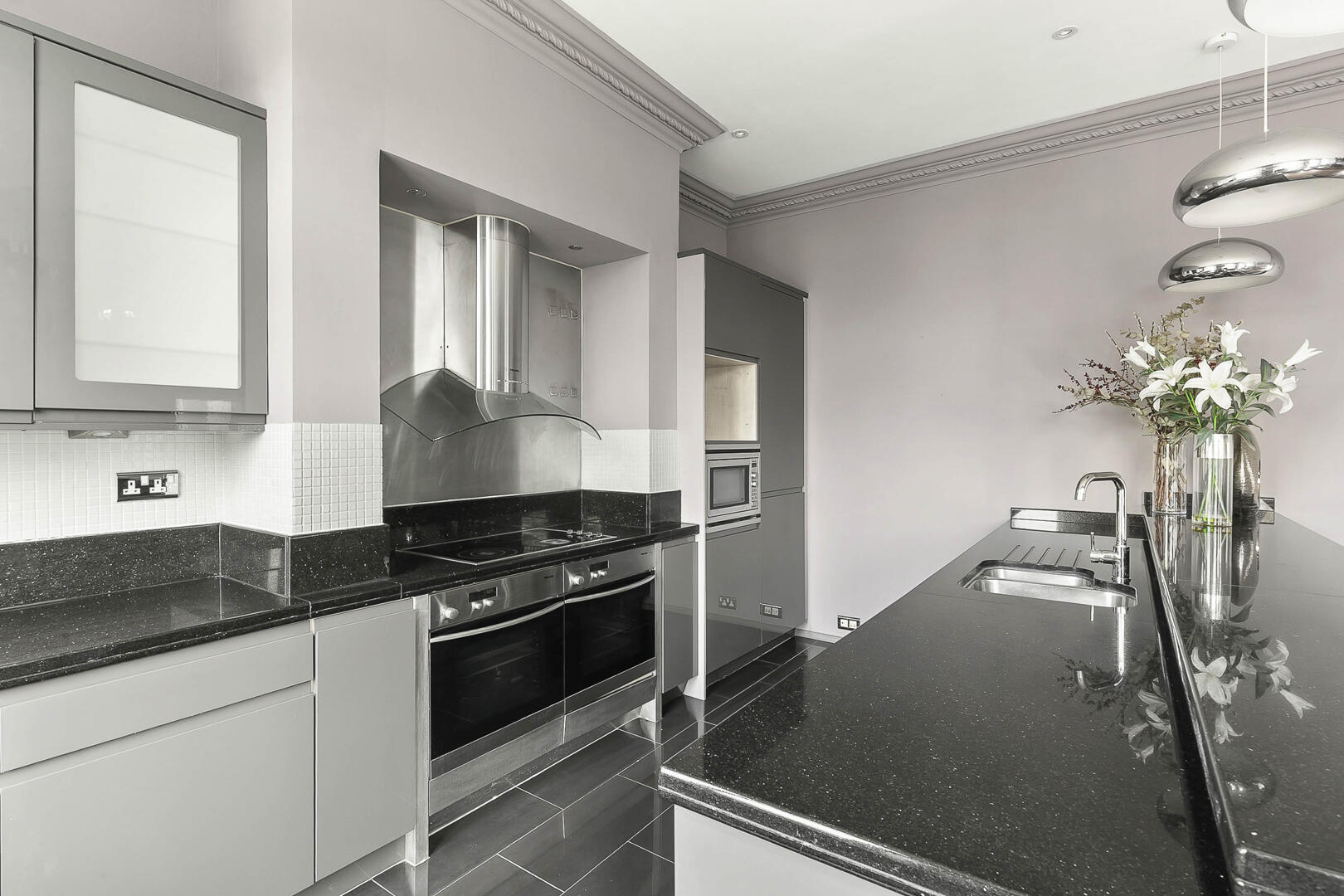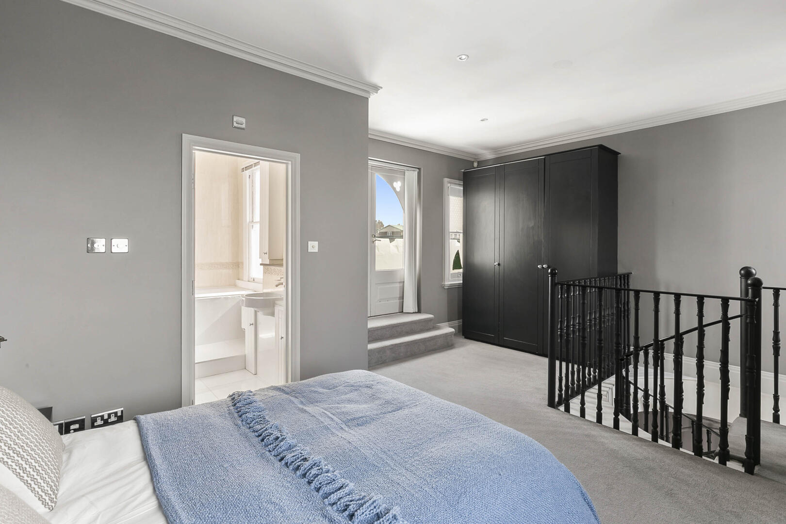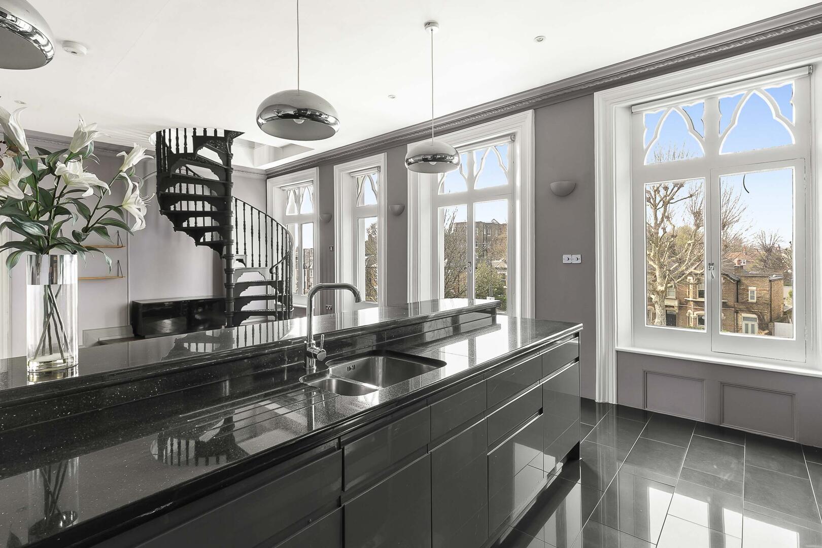 The heart of the property is an outstanding 27' kitchen/reception room with feature spiral staircase and four tall windows, in the Gothic style, bathing the room in natural light. The staircase leads to a stunning principle bedroom with ensuite bathroom, built in wardrobes and access to the private Castellated balcony. On the first floor is an attractive guest double bedroom with ensuite shower as well as the apartment's guest cloakroom.