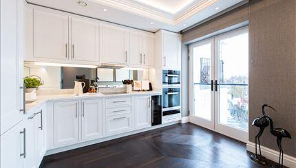 The 843 SQ FT apartment is situated on the third floor and comprises an open-plan integrated kitchen with a Juliet balcony, a large reception/ dining room with impressive entertaining space, bi-fold doors leading onto a superb inside/outside private south-facing balcony, two double bedrooms with ensuite bathrooms, & guest powder room.